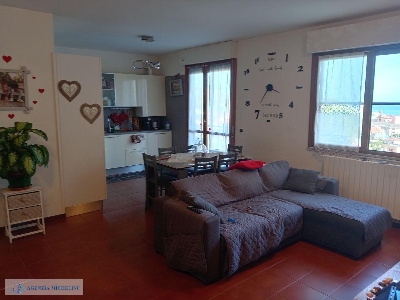 RIVA LIGURE In a quiet and panoramic area, within a small residential complex, spacious four-room apartment in excellent condition, consisting of entrance into a double living room, open-plan kitchen, two large bedrooms, veranda, outdoor space with barbecue, and a large wraparound terrace. The property includes a cellar and an uncovered parking space. Independent heating and air conditioning. Beautiful sea view. Energy Performance Certificate (EPC) pending.